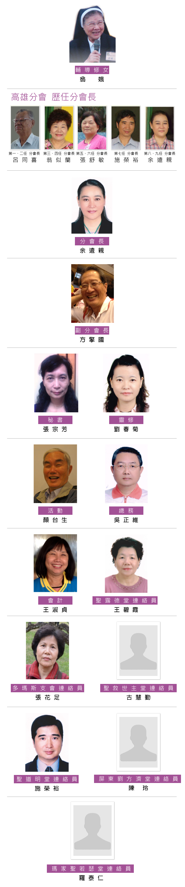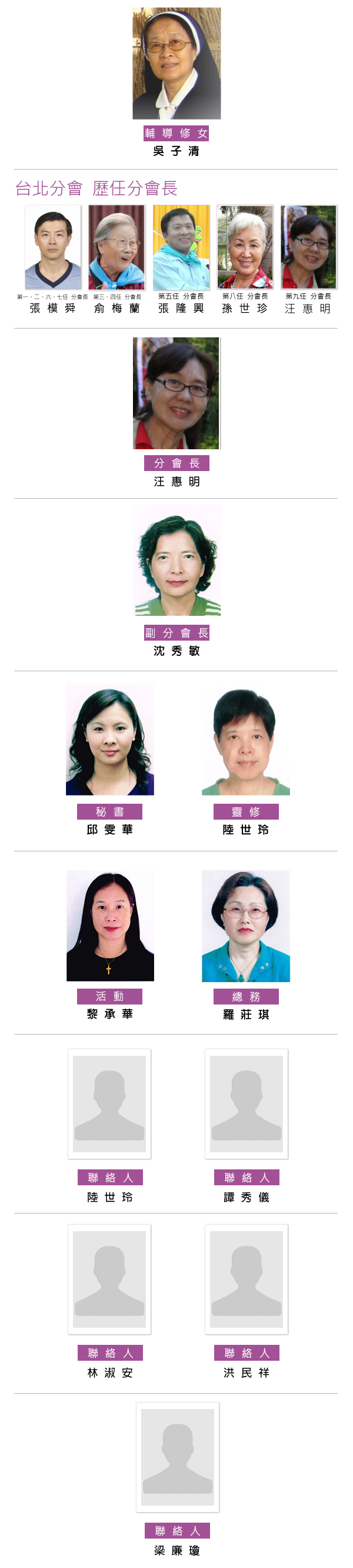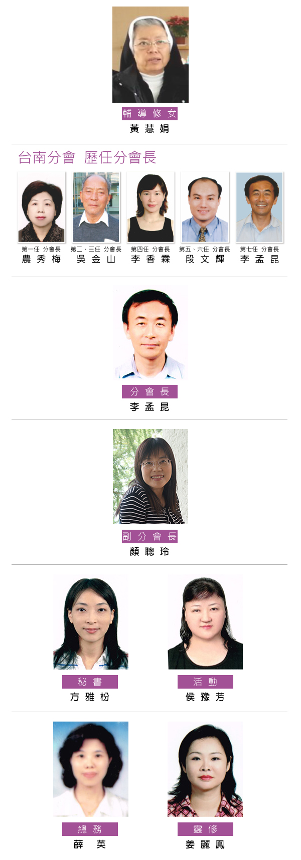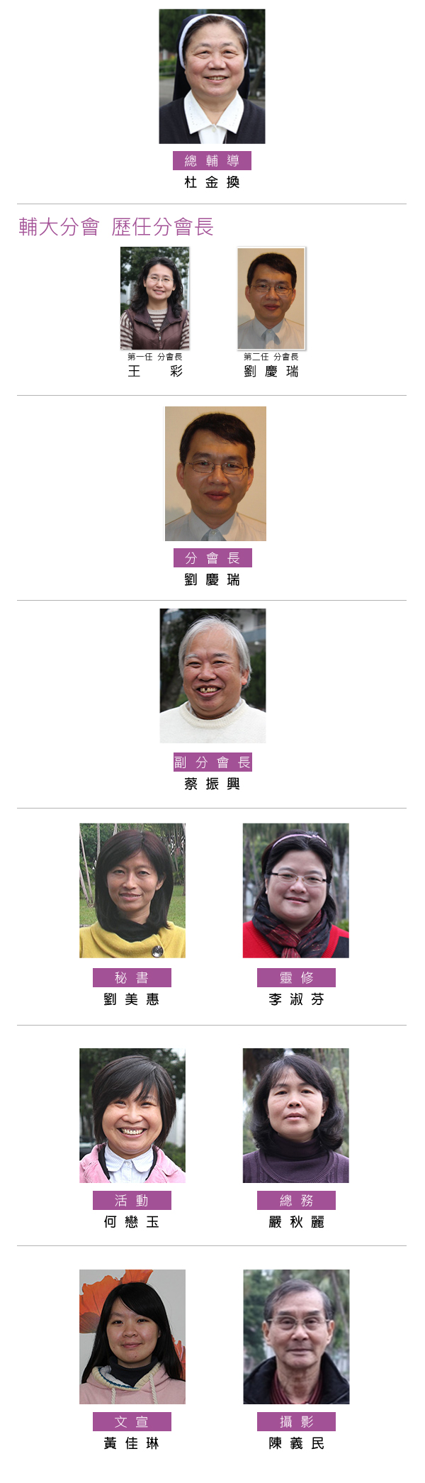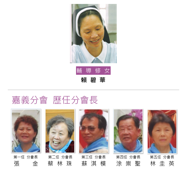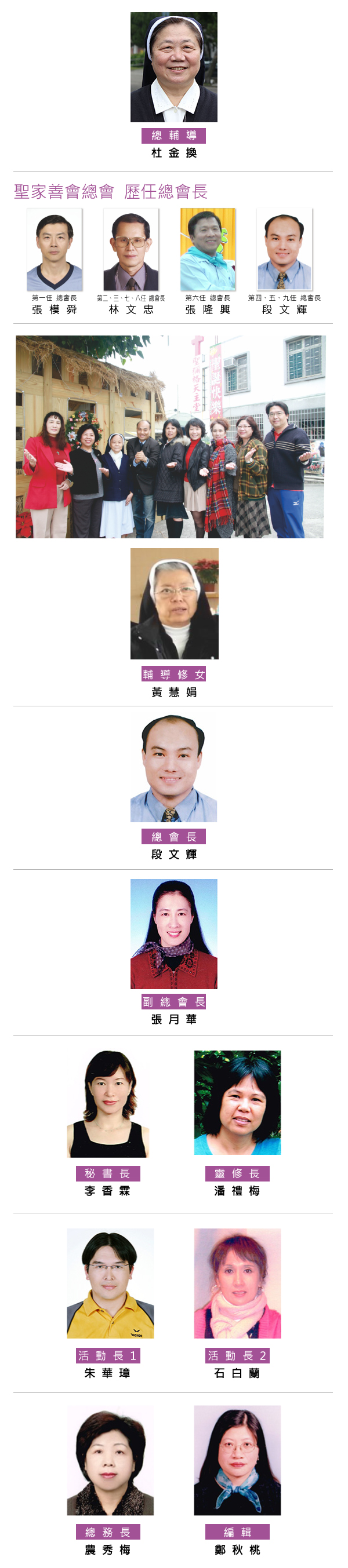 成員 : 林麗卿 修女、劉貴蘭 修女、李貞德 修女、王金梅 修女、趙景華 修女、林惠美 修女、黃慧娟 修女、蘇瑞珠 修女、黃彩杏 修女、鄭美華 修女、吳子清 修女、 王素絹 修女、黃斌瓊 修女