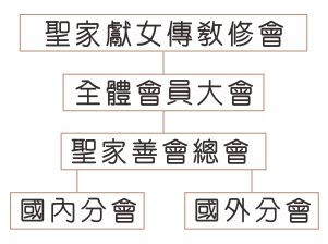 第十二條本會以全體會員大會為最高權力機構,選舉總會長及議決聖家善會章程,每年至少召開一次,聽取總會及各地區分會工作報告及提出討論提案事項;下設總會及地區分會,各地區分會依堂區分佈及人數設置若干支會。(各地區分會會員大會為各地區分會之最高權力機構,選舉地區分會長、聽取地區分會長工作報告,議決地區分會長提出之年度活動計畫、年度經費預算及執行決算情形,並討論有關地區分會之重大提案事項。)第十三條會員代表大會為最高立法機構,其人數總額由總會六人(總會長、副總會長、秘書長、總務長、靈修長、活動長)、各地區分會(分會長、副分會長、秘書、總務、靈修、活動)六人、各支會一人(支會代表)組成之,每年至少召開乙次,其職權如下: